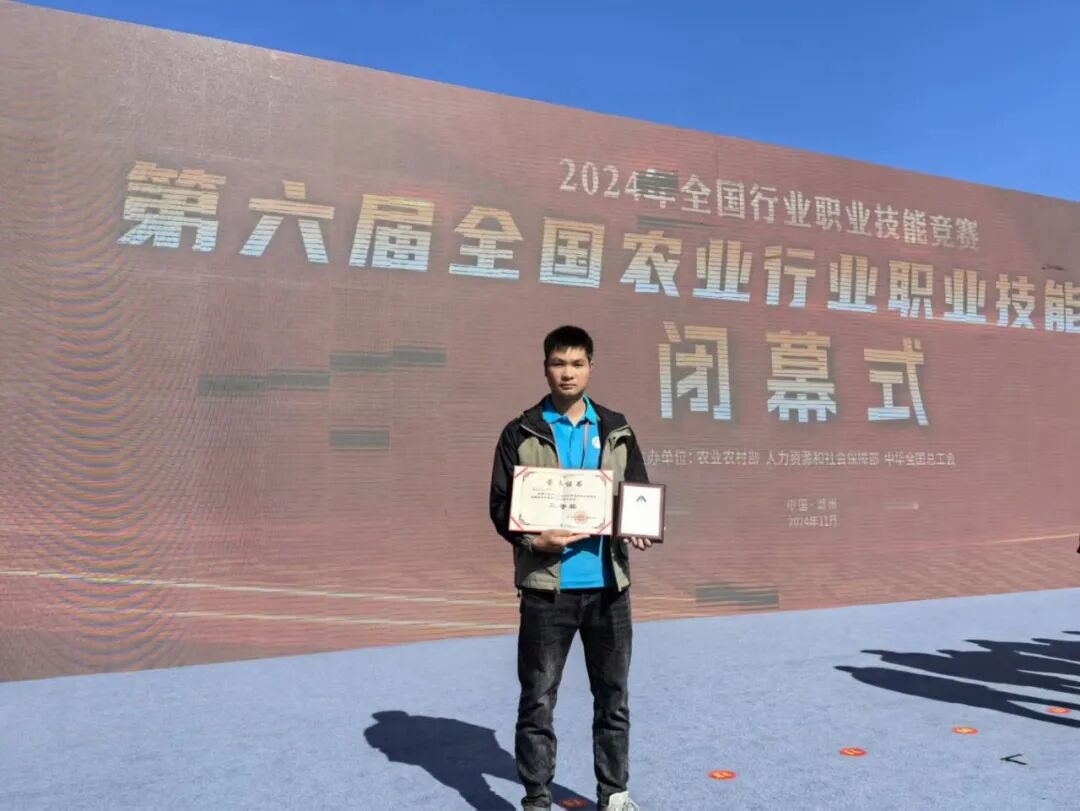 2023年备战广西农机驾驭员职业技能竞赛,他在这儿度过了无数个夜晚。操作精度要求差错不超越2厘米,他就一遍遍练,直到肌肉记住每一个动作的起伏。竞赛时,他操作着水稻联合收割机进行“牵线搭桥”项目,巨大的机器在他手里变得精准而轻盈,终究拔得头筹。